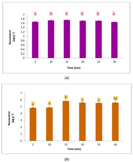 p < 0.05); however, 15 min was chosen due to the energy saving of the process. While, for the marmalade sample, the resveratrol recovery after 10 min was not significantly different (