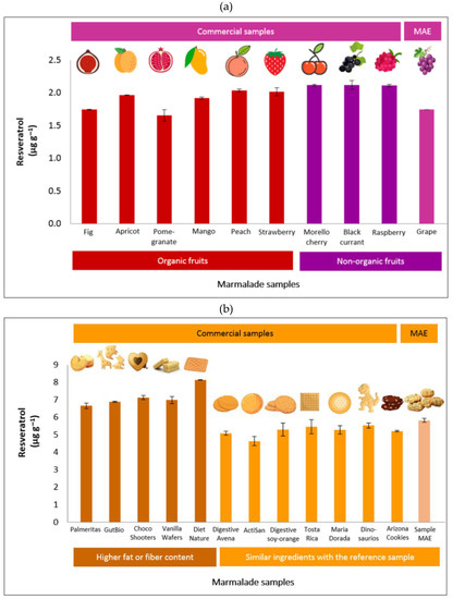 The optimized and valid method was used to extract a large number of samples to check for the matrix effects. This approach determined the quantity of resveratrol in several brands and types of marmalade and cookie products available in the market. For marmalade samples, nine commercial products from organic (fig, apricot, pomegranate, mango, peach, strawberry) and non-organic (Morello cherry, black currant, and raspberry) fruits were used. It was found that the commercial marmalade samples did not contain resveratrol (LOD = 1.5 ppb). Hence, the spiking technique was applied to study the accuracy of MAE for determining resveratrol in marmalade samples. The same level of resveratrol added to the marmalade sample for developing the MAE method was also spiked in all studied marmalade samples. The resulting recoveries are shown in