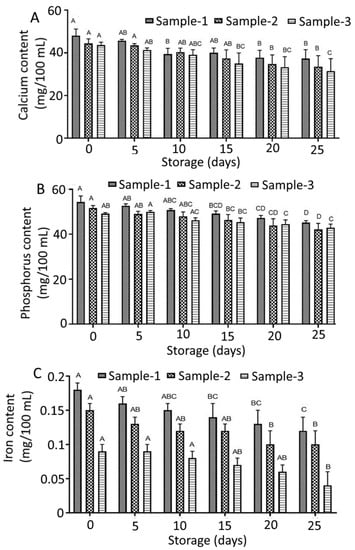 Minerals profile of whey-based mixed beverages: (A) calcium content; (B) phosphorus content; and (C) iron content. All the values are expressed as mean ± standard deviation of three replicates. Different uppercase letters above the same pattern bars indicate significant differences according to Tukey’s multiple comparison test (p < 0.05).