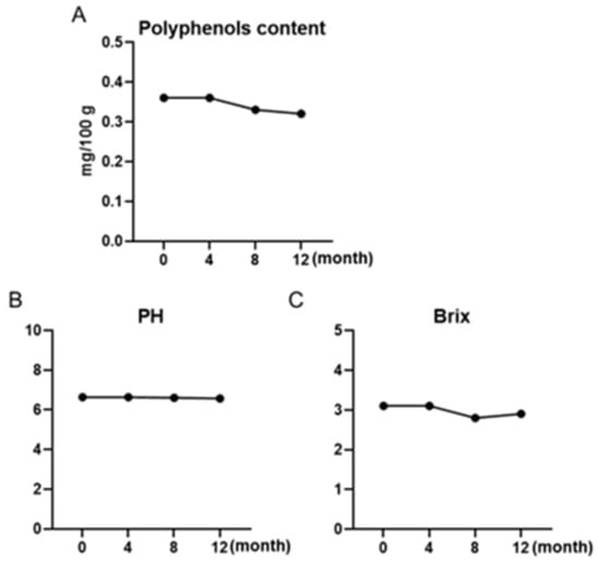 Changes in maple water total phenolic content (A), °Bx (B), and pH (C) during a storage time of 12 months at room temperature. Each sample was measured at time points of 0, 4, 8, and 12 months.