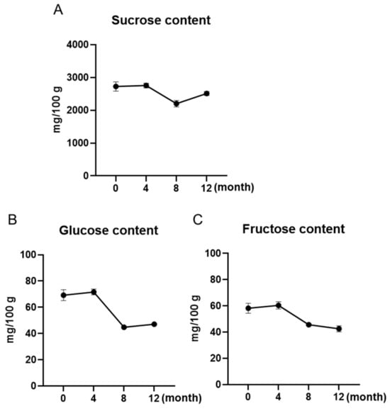 Changes in maple water carbohydrate content including sucrose (A), glucose (B), and fructose (C) during a storage time of 12 months at room temperature. Each sample was measured at time points of 0, 4, 8, and 12 months.