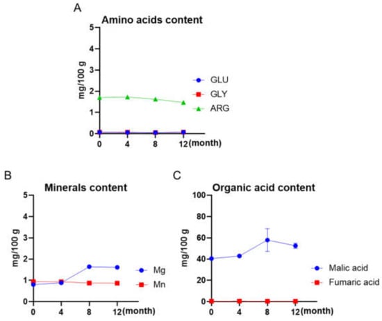 Changes in maple water chemicals including amino acids (GLU, GLY, and ARG) (A), minerals (Mg and Mn) (B), and organic acids (malic acid and fumaric acid) (C) during a storage time of 12 months at room temperature. Each sample was measured at time points of 0, 4, 8, and 12 months.