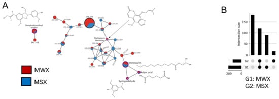 (A) An LC-MS/MS-based molecular network of chemicals from MSX and MWX using the GNPS platform and Cytoscape. Red nodes represent compounds present in MWX, while blue nodes represent compounds present in MSX. Compounds present in both extracts (red and blue) are shown in pie percentages out of a total quantification (100%) in both extracts. The size of each node is relative to the quantification amount of each compound based on ion count. Five total compounds were able to be dereplicated through molecular networking: dehydrodiconiferyl alcohol, a phellopterin analogue, monolaurin, adipic acid (adipate), and syringaldehyde. (B) UpSet plot detailing unique metabolite features found in MWX (G1) and MSX (G2). Intersection size shows the features attributable to each sample or found in both samples.