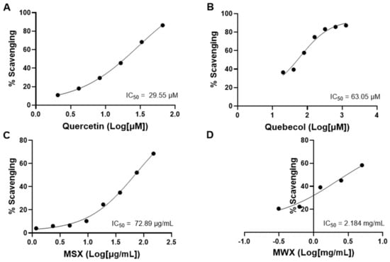 Maple food extracts including MSX and MWX were evaluated for their antioxidant capacity by DPPH assay. At an initial screening (concentration of 1 mg/mL), MSX and MWX scavenged 74.06 and 20.22% of the DPPH free radicals, respectively. Next, a series of concentrations were used to assess the IC50 values of MSX’s and MWX’s free radical scavenging effects. In addition, two positive controls, namely quercetin (a common natural antioxidant) and quebecol (a unique phenolic compound isolated from MSX []), were evaluated by DPPH assay. Quercetin and quebecol showed an IC50 value of 29.55 and 63.05 μM, respectively (Figure 5A,B). MSX and MWX had IC50 values of 72.89 μg/mL and 2.18 mg/mL, respectively (Figure 5C,D).