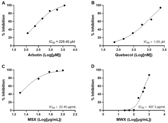 The anti-tyrosinase potential of MSX and MWX were determined using a reported method [,]. Briefly, the assay was performed in a 96-well microplate in triplicate. Samples were dissolved in methanol and diluted to different concentrations with phosphate buffer (0.1 M; pH 6.8). Each well contained a total volume of 200 µL reactants, consisting of 40 µL of tyrosinase enzyme (100 units/mL), 40 µL L-tyrosine (2.5 mM), 80 µL of assay buffer, and 40 µL of test the sample. The plate was incubated at room temperature for 30 min and then the absorbance of each well was measured at a wavelength of 490 nm. The percentage of tyrosinase inhibition was calculated as follows: [(Acontrol − Asample)/Acontrol] × 100%.