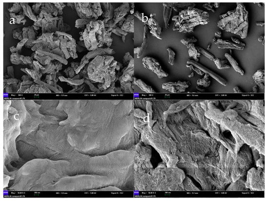 SEM of alkaline microcrystalline cellulose ((a): 20 µm and (c): 200 nm) and microcrystalline cellulose ((b): 20 µm and (d): 200 nm). SEM: scanning electron microscopy.