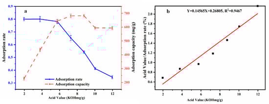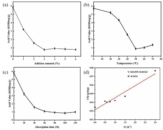 Based on the above condition, adsorption equilibrium effect experiments were carried out at different acid values (1.97~11.96 (KOH mg/g)) while other variables were set at a reaction temperature of 50 °C for 60 min, adding 3% adsorbent-alkali microcrystalline cellulose. From Figure 2a, we can observe that for the acid values less than 6 (KOH mg/g), the adsorption effect was good, and the absorption rate reached up to 80.03%.