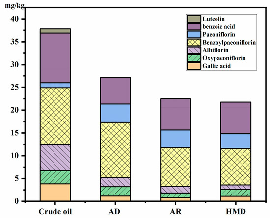 Paeoniflorin (1.08 mg/kg), oxypaeoniflorin (2.90 mg/kg), paeoniflorin (12.34 mg/kg), benzoylpaeoniflorin (5.82 mg/kg), luteolin (0.90 mg/kg), benzoic acid (10.92 mg/kg), and gallic acid (3.83 mg/kg) are the targeted bioactive compounds in PSO, which play essential roles in treating inflammation, cancer, allergies, diabetes, angiocardiopathy, and neurodegenerative diseases []. As seen in Figure 4, the contents of benzoylpaeoniflorin and benzoic acid occupied 65.66%, 68.18%, and 68.36% of the total polyphenol content after adsorption deacidification, alkali refining, and oil-hexane miscella deacidification, respectively.