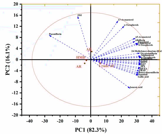 The relative contribution of principal components (PC) was determined by only considering eigenvalues greater than one. Figure 5 shows variables that accounted for the total variability of 98.4% for PC1 (82.3%) and PC2 (16.1%) in the data set. Compared with deacidified oil, crude oil had higher fatty acid content and other bioactive content, such as benzoic acid, squalene, gallic acid, and FRAP, but it had lower paeoniflorin, OSI, α-tocopherol, and Δ-7 avenasterol content. At the same time, compared with the other two refining methods, it can be seen that the OSI and paeoniflorin content of PSO after adsorption increased, and the loss of active components was less. The values of the OSI and paeoniflorin content of PSO changed significantly after refining and were distributed on the left side of the figure. Chemical refining and mixed refining were also both distributed on the left side, which indicates that their fatty acid content and the biologically active ingredients were both greatly reduced, and they were all negatively correlated. Therefore, we divided the PSOs deacidification process research into three different groups in addition to the crude oil group. These include adsorption deacidification as a group, chemical adsorption as a group, and mixed refining as a group. Overall, except for OSI and paeoniflorin, the chemical composition and antioxidant activity of PSO decreased significantly after deacidification.