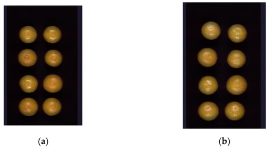 Tribute Citru fruits were purchased from a local orchard in Liuzhou, Guangxi Province, China. A total of 458 samples of Tribute Citru fruits with similar sizes and no apparent damage on the surface were harvested on 22 November 2021. Before image acquisition, the fruits were stored at transported for four days and stored in the experimental room at a relatively stable temperature (15 ± 1 ℃) for three days. All the samples were numbered sequentially and awaited the acquisition of hyperspectral images and subsequent SSC measurement. Figure 1 shows the RGB (red, green, and blue) images of citrus taken by the hyperspectral imaging system. The image of the fruit blossom end and the calyx end are shown in Figure 1a,b, respectively.