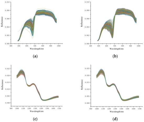 Figure 2 shows the VIS/NIR reflectance spectra (obtained by FX10) and NIR reflectance spectra (obtained by NIR), with the horizontal coordinates indicating the 487–974 nm bands and the 933–1690 nm bands and the vertical coordinates indicating the reflectance of the spectra. Figure 2a,b shows the VIS/NIR spectra of the fruit calyx end (abbreviated as FX10-SP-A) and the fruit blossom end (abbreviated as FX10-SP-B) after removing the outlier samples. Figure 2c,d shows the spectral curves of the two sampling sides at the NIR range (FX17-SP-A and FX17-SP-B, respectively) after removing the outlier samples. It could be seen that the trends of the SP-A and SP-B curves were quite similar for each hyperspectral imaging system. From the spectral profiles, exploring the differences between the two sides for SSC measurement was difficult.