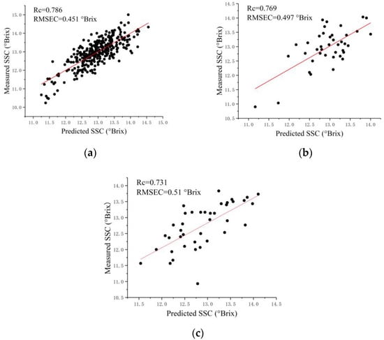 Scatter plots of the measured SSC values and predicted SSC values by SVR. (a) FX10-SP-A of calibration set; (b) FX10-SP-A of validation set; (c) FX10-SP-A of prediction set.