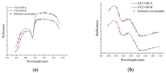 Characteristic wavelengths obtained with SPA. (a) Selected wavelengths of VIS/NIR spectra including SP-A and SP-B; (b) selected wavelengths of NIR spectra including SP-A and SP-B. (Note: Given that the average spectra of the two sides partially overlap and are not convenient for observation, the reflectance values of the SP-B spectra of FX10 were averaged and increased by 0.01, and the reflectance values of the SP-B spectra of FX17 were averaged and increased by 0.001).