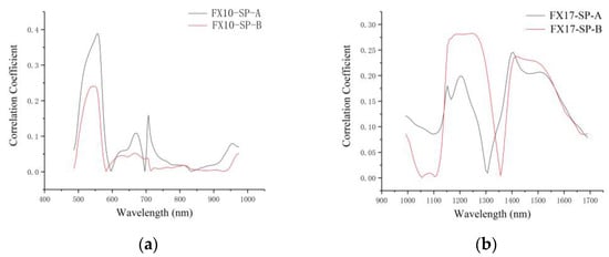 Correlation coefficient corresponding to the wavelengths. (a) Correlation coefficient curves of VIS/NIR averaging spectra (FX10); (b) correlation coefficient curves of NIR averaging spectra (FX17).