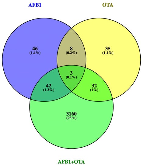 Venn diagram for the DEGs found by RNA-seq in Jurkat cells treated with AFB1, OTA, AFB1 + OTA at 100 nM in 0.1% DMSO compared to 0.1% DMSO control exposure. DEGs p-value ≤ 0.05 and log2FC |0.5|.
