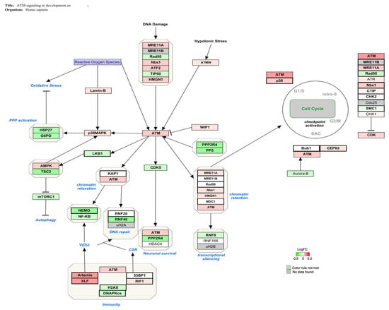 The genes involved in the ATM signaling pathway (Z-score: 4.15) for Homo sapiens are shown in Figure 2, indicating in red the over-expressed genes and in green the down-regulated genes ones. A slight alteration in ATM-related gene expression was obtained.