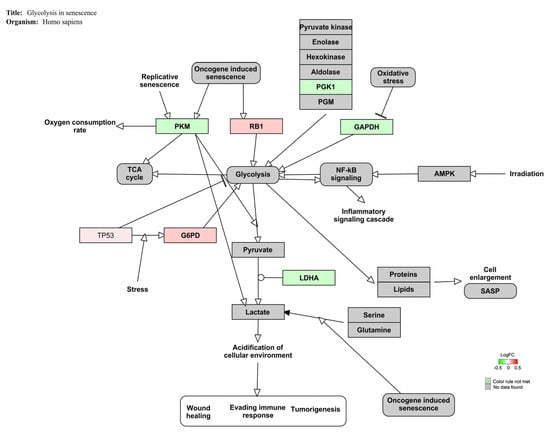Genes implicated in glycolysis senescence pathway for Homo sapiens are represented in red and green. The up-regulated genes are represented in red and the down-regulated ones upon OTA exposure (100 nM) are represented in green.