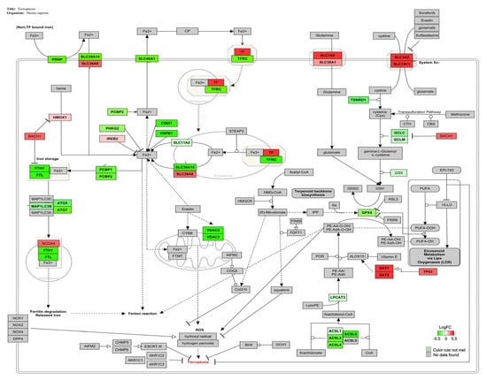 Genes involved in ferroptosis pathway for Homo sapiens are represented in red and green. The up-regulated genes are represented in red and the down-regulated ones following AFB1-OTA exposure (100 nM for both toxins) are represented in green.