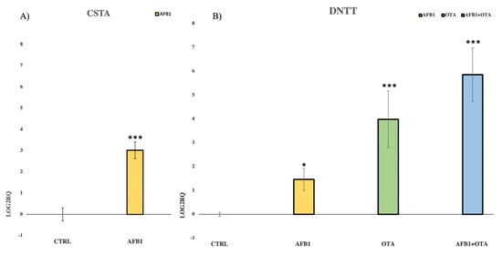 Bar plots showing the relative expression of (A) CSTA and (B) DNTT when compared to the control (Log2RQ = 0) after 7 days of exposure in Jurkat cells to AFB1 (100 nM) for CSTA and to AFB1, OTA, AFB1 + OTA (100 nM in all cases) for DNTT by qPCR. RQ: relative quantification; CTRL: control; CSTA: cystatin A; DNTT: DNA nucleotidylexotransferase. p ≤ 0.05 (*), p ≤ 0.001 (***).