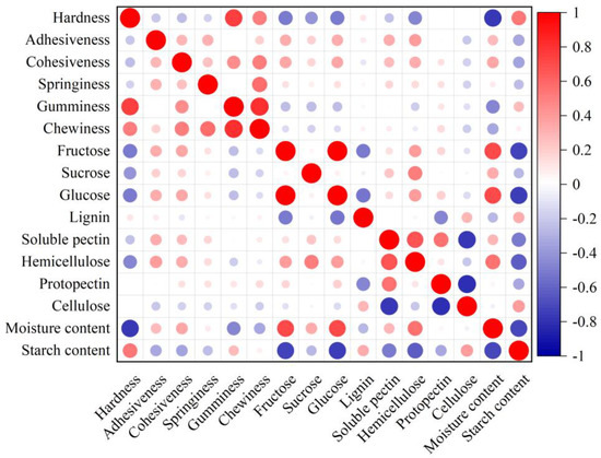 As shown in Figure 1, 16 quality indicators were correlated to some extent. There was no significant correlation between lignin content, soluble pectin content, and cellulose content regarding texture indicators. Hardness had a negative correlation with cohesiveness, fructose, sucrose, glucose, hemicellulose and moisture content (R = −0.259, p < 0.05; R = −0.512, R = −0.405, R = −0.501, R = −0.470, R = −0.760, p < 0.01, respectively) and a stronger positive correlation with gumminess, chewiness, and starch content (R = 0.752, R = 0.509, R = 0.537, respectively; p < 0.01). This indicates that the starch content accumulated in tuberous roots may increase in hardness, while fructose, sucrose, glucose, hemicellulose, and moisture content decrease.