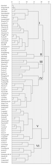 Cluster analysis of quality traits in the tuberous roots of 81 sweet potato varieties. Roman numerals I to VI indicate six groups.