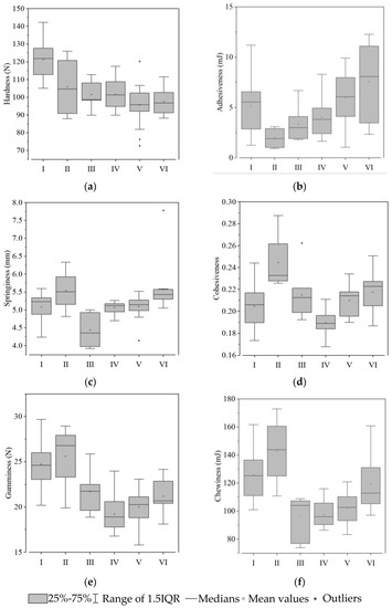 Textural properties of the tuberous roots of six sweet potato characteristics: (a) hardness; (b) adhesiveness; (c) springiness; (d) cohesiveness; (e) gumminess; and (f) chewiness. Hollow squares indicate mean values. Rhombuses indicate outliers.
