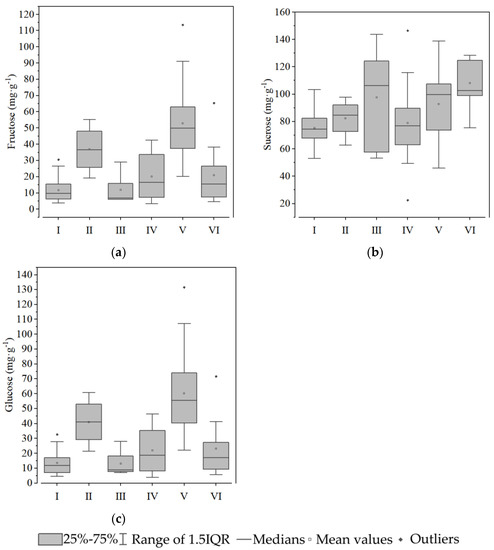 Soluble sugar components of the tuberous roots of six groups of sweet potato: (a) fructose; (b) sucrose; and (c) glucose. White squares indicate mean values. Rhombuses indicate outliers.
