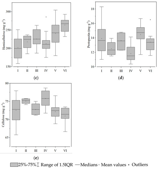 Cell wall components of the tuberous roots of six groups of sweet potato: (a) lignin; (b) soluble pectin; (c) hemicellulose; (d) protopectin; and (e) cellulose. White squares indicate mean values. Rhombuses indicate outliers.