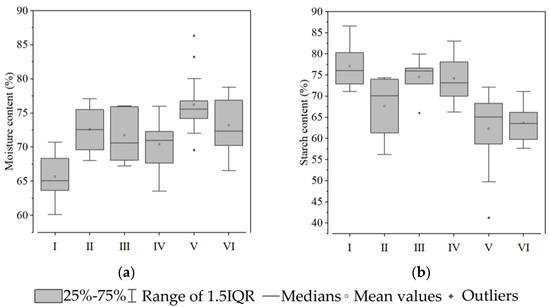 Moisture and starch content of the tuberous roots of six groups of sweet potato: (a) moisture content; and (b) starch content. White squares indicate mean values. Rhombuses indicate outliers.