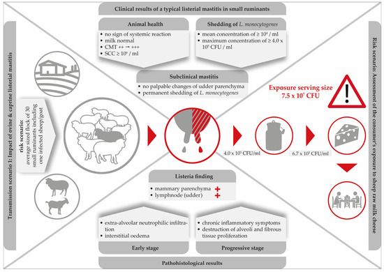 Literature findings suggest that caprine and ovine mastitis are very much comparable. Furthermore, the typical listerial mastitis in small ruminants is defined: (i) by its subclinical nature; (ii) a high somatic cell count (≥106 SCC per ml); (iii) persistent shedding of the pathogen bacteria; (iv) by induration and atrophy of the mammary parenchyma in progredient stages of the infection and, finally; (v) the local invasion via the teat canal seems to be the most likely route of infection. Figure 2 illustrates the main clinical and pathological findings of listerial mastitis in small ruminants. A risk scenario was designed to highlight the dimension of the consumers’ exposure.