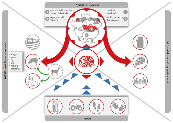 Listeriosis of small ruminants is well documented and there is a numerous number of case studies, including two comprehensive review articles. However, case studies focusing on the impact on milk processing are scarce [18,76,77] (Figure 1). The disease is clearly and most commonly caused by oral infection, but other entrance sites, such as the conjunctiva, microlesions of the skin, buccal and genital mucosa, or the teat canal have also been described [89]. After oral infection, L. monocytogenes is able to colonize the gastrointestinal tract. Animals either become asymptomatic carriers or they develop mild symptoms of a self-limiting enteritis. In both cases, the bacterium is shed with the faeces and is able to heavily contaminate the farm and milk processing environment (Figure 3), [4]. The interplay of environmental reservoirs outside the farm and of vectors and the farm animals is shown in Figure 3. Notably, the excretion of L. monocytogenes by the farm animals is not only a food safety and herd health issue, but can also contribute to infection of wildlife.