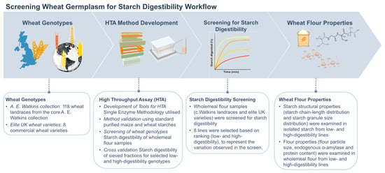 Three low-digestibility lines: 777 (WATDE0111), 216 (WATDE0025), and 639 (WATDE0083); and five high-digestibility lines: including two c.Watkins landraces 816 (WATDE0117), 308 (WATDE0042) and the three UK elite varieties Myriad, Dickens, and Paragon were selected for further analysis. The selection was based on the starch digestibility HTA results, specifically the ranking (low to high), to represent the variation observed in the screen.