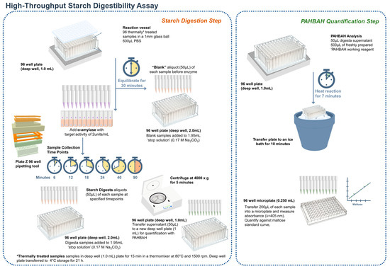 The HTA (detailed in the Section 2) was scaled from a 6-tube format to a 96-well plate format which required optimizations for maintaining even heat distribution during starch digestions and PAHBAH assays, for the mixing ability of samples, and for recovering adequate sample volumes for analysis. We also developed new tools to allow faster sample handling for sample preparation and pipetting (Plate Z, available free to download from hackster.io, (accessed on 16 November 2022). A graphical scheme is presented in the Supplemental Materials highlighting the changes made to develop the HTA (Supplementary Figure S8).