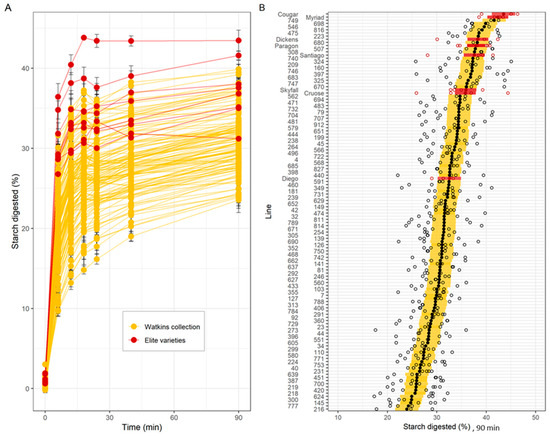 Starch digestibility and total starch of c.Watkins landraces (yellow) and elite varieties (red) of wholemeal flour. (A). Starch digested (%) for c.Watkins (yellow) and elite varieties (red). Points and lines represent the mean and standard error from between 3 and 6 technical replicates per line. (B). Starch digested (%) at 90 min. Individual data points from technical replicates are shown in white dots, and marginal mean values from a mixed effects model with line as a fixed effect and experimental run as a random effect are shown in black (c.Watkins) and red dots (elite). The standard error estimated from the model is displayed as yellow (c.Watkins) and red (elite) bars. Values represent mean ± SE of n ≥ 3 replicates.