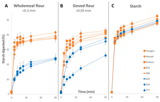 Starch digestibility of selected low- and high-digestibility lines measured in wholemeal flour (A), sieved flour (B) and purified starch (C) using the HTA. Samples in blue represent the low-digestibility lines, and samples in orange represent the high-digestibility lines. Values represent mean ± SE of n = 3 replicates.