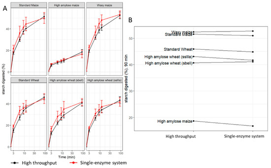 Digestion profiles of maize and wheat starch standards were comparable to profiles generated using the single-enzyme system protocol in Edwards et al., 2019 [33] (Figure 5A). For example, the difference in the average estimates at 90 min (Figure 5B) from the two methods was −0.72 percentage points (not statistically significant), and the technical variation observed at 90 min within the runs was 2.1 percentage points in the HTA and 2.2 percentage points in the single-enzyme system protocol, suggesting that the HTA is not biased and is no less reliable.