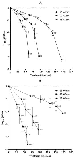 Survival curves corresponding to the inactivation of S. cerevisiae and O. oeni at different electric fields (15, 20, and 25 kV/cm) are shown in Figure 1A,B, respectively. The numbers next to the symbols indicate the outlet temperature of wine attained during PEF processing. Due to the wine’s short residence time in the treatment chamber (0.22 s), no heat is exchanged with the surroundings. Consequently, all of the electrical energy delivered to the treatment chamber to generate the electric field is transformed into heat, thereby increasing the wine’s temperature. However, in the experimental approach used in this study, wine was cooled below 20 °C within 5 s after the PEF treatment, independently of the outlet temperature. As can be observed in the two graphs, the temperature increased with the treatment time (number of pulses × pulse width).