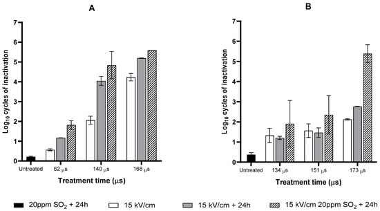 Several authors have reported that when PEF treatments are applied to a microbial population, a proportion of cells is sublethally injured, and this is more evident when moderate conditions are applied []. The final recovery or death of that injured population is directly dependent on either optimal or adverse recovery conditions [,]. Preventing the reparation of sublethal injuries caused by PEF by adding preservatives is a strategy that can increase the lethality of moderate PEF treatments [,,,]. Figure 2 illustrates the inactivation of S. cerevisiae (Figure 2A) and O. oeni (Figure 2B) in the respective wines after fermentation by combining PEF treatments of different durations at 15 kV/cm with the addition of 20 ppm of SO2 evaluated 24 h after processing. The lethal effects of the individual treatments are also shown in order to identify if the effect of the combined treatments was additive or synergic. Figure 2A,B show that the added SO2 scarcely affected the viability of the untreated cells of S. cerevisiae and O. oeni. On the other hand, the inactivation of PEF-treated cells of S. cerevisiae maintained for 24 h in wine without added SO2 increased significantly. For example, the inactivation detected just after the 140 µs PEF treatment increased from 2.0 to 4.0 Log10 cycles after 24 h. This effect could be explained by the supposition that the presence of ethanol and the content of free sulfites in the wine (14.7%; 19.2 ppm, see Table 1) prevented the recovery of a proportion of the yeast cells that had been sublethally injured as a consequence of the PEF treatment. The addition of 20 ppm of SO2 barely increased lethality compared with wines treated solely with PEF; the difference is not statistically significant (p > 0.05). The yeast cells that survived in PEF-treated wine during 24 h were thus unaffected by the addition of 20 ppm of extra sulfites.
