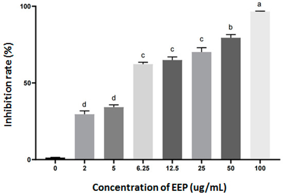 Inhibition rates of SU-DHL-2 cell proliferation by different concentrations of EEP for 24 h. Different letters indicate statistical differences between groups (p < 0.05).