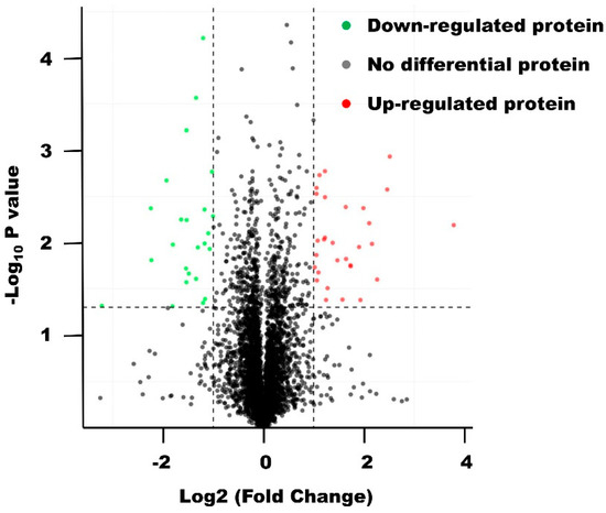 Differential proteins were screened according to FC > 2.0 or FC < 0.5 and p < 0.05 (EEP vs. control groups). There were 61 up-regulated proteins, and 54 down-regulated proteins (partly differential proteins (p < 0.01) were shown in Supplementary Table S3). Volcano plot of proteins in SU-DHL-2 cells of the two groups was shown in Figure 2.