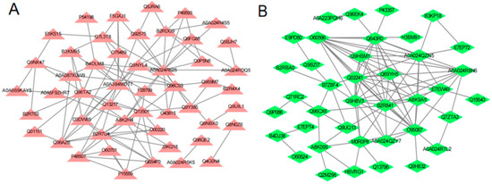 Interaction of differential proteins: (A) interaction diagram of differentially up-regulated proteins; (B) interaction diagram of differentially down-regulated proteins. The triangles or diamonds represent proteins, straight lines represent the interaction relationship between proteins.