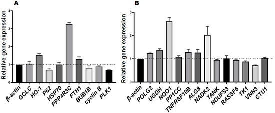 The results of relative gene expression were shown in Figure 4. The expressions of GCLC, HO-1, PPP4R3C, and FTH1 were up-regulated; the relative expressions of BUB1B, Cyclin B, and PLK1 were down-regulated. They are consistent with the protein expression trend with exception of p62 and HSP70 genes. The relative expression of POLG2, UGDH, NQO1, PPP1CC, TNFRSF10B, ALG8, and NADK2 were up-regulated, and that of RASSF6, TK1, and VNN3 were down-regulated. These gene expressions trends were consistent with the coded protein expressions trends with exception of HSP70, NDUFS3, and CTU3 genes.