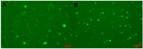 ROS staining of SU-DHL-2 cells: (A) control group; (B) treatment group, propolis at IC50 (×100).