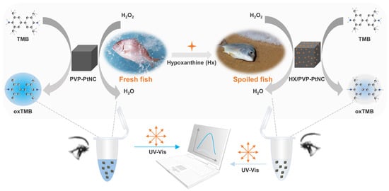 Taking the above into consideration, the research objective is to construct a conventional colorimetric sensing platform for fish freshness determination. Herein, we hypothesized a colorimetric method for the determination of Hx based on the downregulation of peroxidase activity of the polyvinylpyrrolidone-modified platinum cubic nanomaterials (PVP-PtNC). This strategy lies in our finding that the Hx can block the active catalytic sites on the PVP-PtNC surface so that the ultra-high catalytic ability of PVP-PtNC can be downregulated directly by Hx. Once encountered with the H2O2 to catalyze the oxidation of TMB, a typical peroxidase substrate, the significantly weakened peroxidase activity would powerfully inhibit the generation of oxidized blue products. Therefore, this sensing platform can realize the quantitative determination of Hx without the assistance of a natural enzyme (XOD). Our results showed that the morphology of PVP-PtNC was well demonstrated by transmission electron microscopy (TEM). The decrease in the UV–vis absorption and the weakening of the colorimetric reaction color is proportional to the Hx concentration. Moreover, benefiting from the wide linear response range, low detection limit, high specificity, and repeatability, this colorimetric nanosensing method has been successfully applied to analyze real fish samples in only 10 min. Such a nanozyme-based sensing platform with its minute-time scale detection merit would thus open a new avenue for the online monitoring of aquatic products’ freshness.