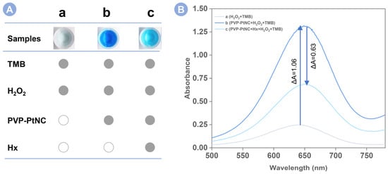 (A) Photographed images and (B) UV–vis absorption spectra of (a) TMB + H2O2, (b) PVP-PtNC + TMB + H2O2, and (c) PVP-PtNC + Hx + TMB + H2O2.