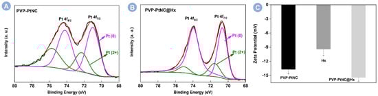 Pt 4f XPS spectra of PVP-PtNC before (A) and after (B) incubated with Hx. Black, red, magenta, and green lines represent the raw curve, the fitted curve, the Pt (0), and the Pt (II) components’ curves, respectively. (C) Zeta potential measurements of PVP-PtNC, Hx, and their mixture.