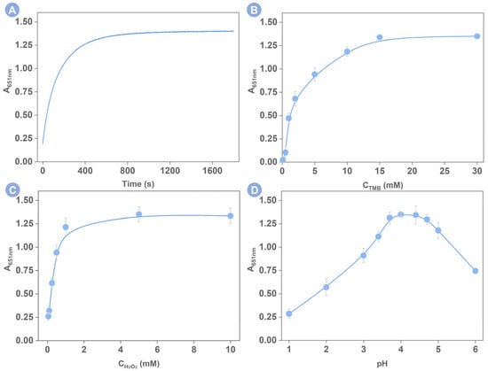Influences of (A) the reaction time, (B) the concentration of TMB, (C) the concentration of H2O2, and (D) the pH of the reaction solution on the catalytic reaction between TMB and H2O2. Error bars were obtained from three repetitive experiments.