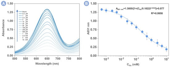 Under optimized conditions (Figure 4), the developed colorimetric sensor was used to detect Hx based on the reverse regulation of peroxidase activity of PVP-PtNC. As shown in Figure 5A, with the increase in the Hx concentrations, the UV–vis absorption spectra gradually decreased. This is reasoned by the inhibiting effect of Hx on the PVP-PtNC catalytic activity. Figure 5B plotted the peak absorption at 651 nm dependent on the Hx concentration. In the Hx concentration range from 0 to 10 mM, the four-parameters logistic relationship was obtained between the peak absorption value (A651) and the concentration of the Hx. The equation was y = 1.3005/[1 + (x/0.1822)0.5254] + 0.077 (R2 = 0.9958), where y was the absorbance intensity at 651 nm, and x was the Hx concentration. The limit of detection (LOD) calculated by 3σ/slope is 0.16 μM. Compared with reported fluorescent and electrochemical detection methods or paper-based device in Table S2, the current colorimetric Hx detection method not only shows a lower LOD but also is easy to operate and able to output detectable signals quickly. A previous study has related the concentration of HX to freshness, suggesting that the fish is fresh if the HX concentration is below 250 μM and spoiled at >630 μM [34]. As shown in Figure S3, the colorimetric images show that fresh fish and rotten fish have distinct color differences. Therefore, the colorimetric signal output pattern does not require the use of expensive instruments and professional operators, which can realize semi-quantitative detection directly based on the naked eye.