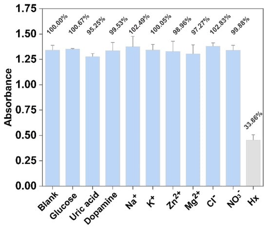 Peak absorption values of the sensing system in the absence and presence of glucose, uric acid, dopamine, Na+, K+, Zn2+, Mg2+, Cl−, NO3−, and Hx, respectively. The concentration of Hx was 1 mM, while other non-target species is 5 mM. Error bars were obtained from three repetitive experiments.