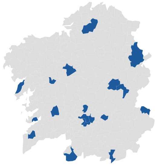 Distribution of geographical origin by municipality in blue of the bee pollen samples in Galicia (Northwest Spain). Created with Datawrapper.